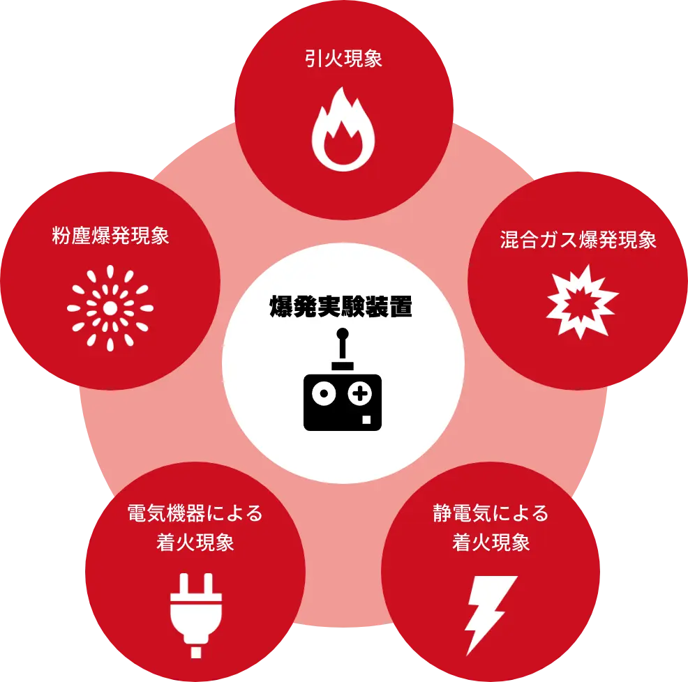 各種要因により起こりうる発火、引火、混合ガス爆発現象、粉塵爆発現象、静電気による着火、非防爆機器の着火から爆発に至るまでの現象を、動画・テキストだけでは伝わらないリアルな体験を通して、防災に関する教育を行うことができます。