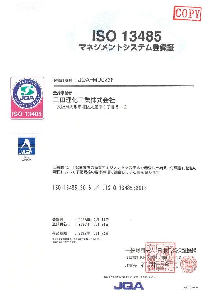 三田理化工業は、2025年7月28日付けで、ISO9001、ISO13485の認証を更新しました。
