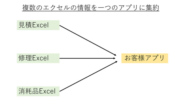 お客様に納品した製品の修理情報、これまでは「機器情報」「お客様情報」「進捗管理」の3つのエクセルにそれぞれ似た情報を入力していました。それが、kintoneでは一つのアプリに入力するだけで、その他のアプリにも表示することが出来るようになります。