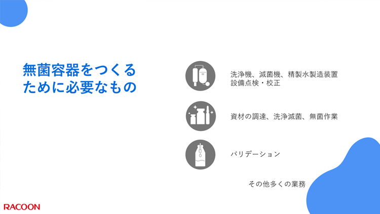 ただ、バイアルを始めとする無菌注射薬容器を製造するには、精製水設備、洗浄機、滅菌機、クリーンルームなどを全て用意した上で、作業者の確保・教育、定期的な校正・点検の実施しなければならず、多くのものが必要です。