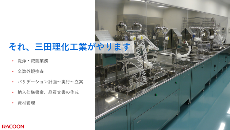 三田理化工業の開発センターでは、全国の病院、製薬会社様に向けた洗浄滅菌済み消耗品を毎日生産しています。