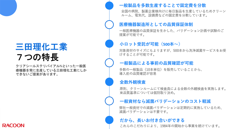 日々の安定した多品種小ロット生産、それらを実現する生産設備と熟練作業者、そして医療機器製造を支える品質管理部門、これらを兼ね備えているからこそ、病院様、製薬企業様といった薬に関わるお客様と長くお付き合いさせていただいております。