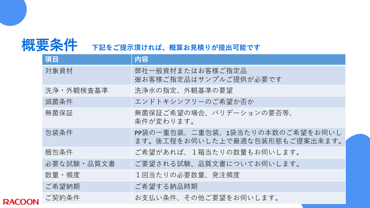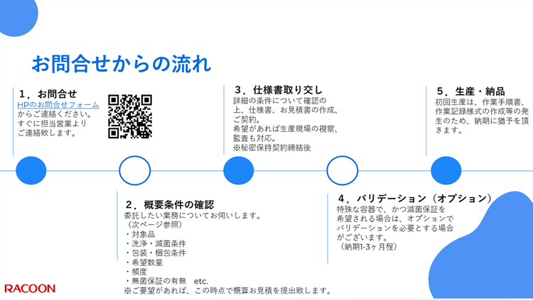 弊社ホームページのお問合せフォームからお問合せください。弊社担当営業よりご連絡致します。その後、下記の概要条件を確認させて頂いた後、弊社受託の可否、概算のお見積りをご提出させていただきます。