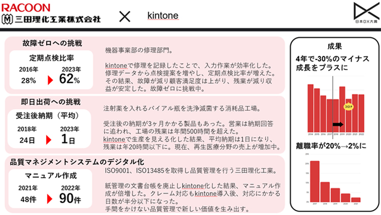 この時、三田理化工業の売上は大幅に減少、離職率は20%を超えるといった状態にあり、変革は急務でした。この時の変革の一つがkintoneというノーコードツールの導入です。