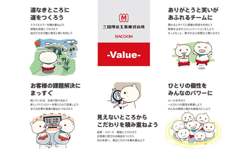 これらのバリュー(共通価値観)を今三田理化工業に所属する社員、そしてこれから入社いただく方々、そして一緒に価値を作っていく、提供させていただく皆様とも共有するために、バリューを文書化しました。