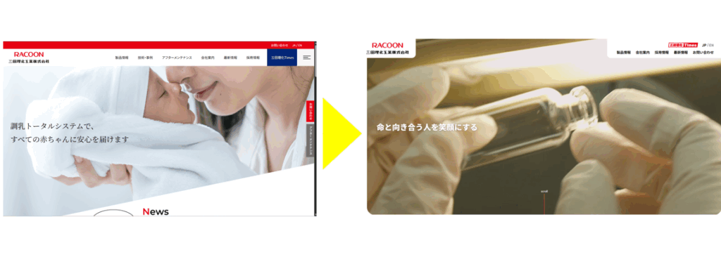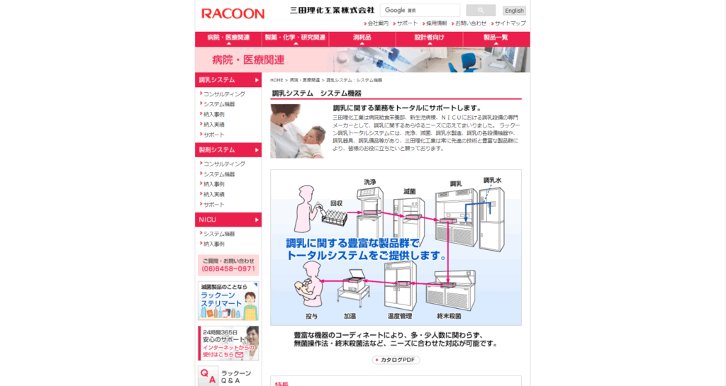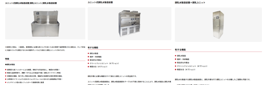 今回のリニューアルでは、トップページから製品まで出来るだけ早く到達できるようにしました。製品ページもお客様の使用目的に応じて並び替えました。前回は1製品1ページでしたが、似た製品は同じページで表示できるようにし、お客様のクリックを減らし、情報を比較して得ることができるようにしました。 例:ユニット式調乳水製造装置/調乳ユニット/調乳水製造装置