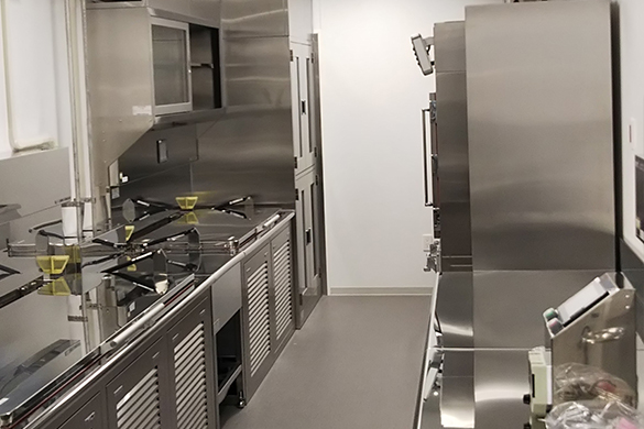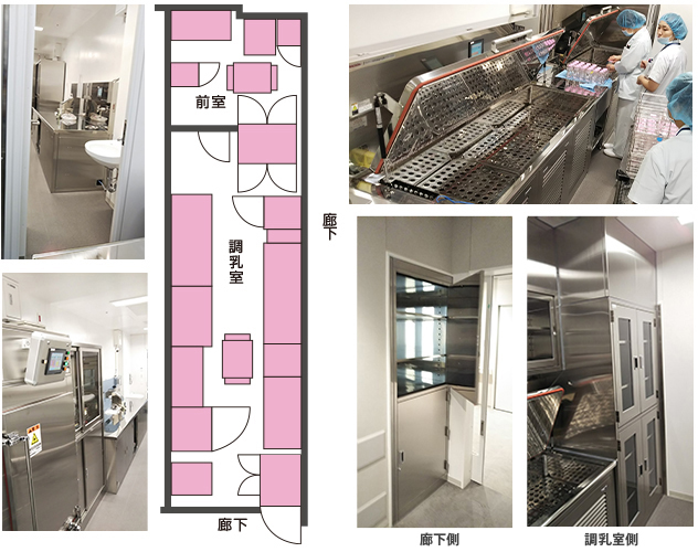 産科・小児科病棟の一角に調乳室を設けることでミルク運搬時の時間・導線の短縮、感染リスクの軽減を行いました。 ミルク作成後に分注機を用いて正確に小分けを行い、量の違いにも対応した湯煎式の終末殺菌冷却槽で殺菌から冷却まで自動で行っています。 哺乳瓶、乳首、シリコンキャップは、別階の中央材料部で洗浄・滅菌して滅菌バッグに梱包され、パスボックスを使用して調乳室へ搬入されます。 調乳器具類や滅菌バッグ開梱後の未使用の哺乳瓶等は、翌日使用するためボトルスチーマーにて滅菌・消毒を行います。