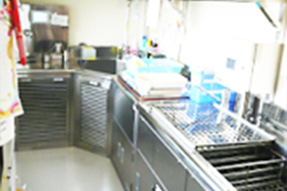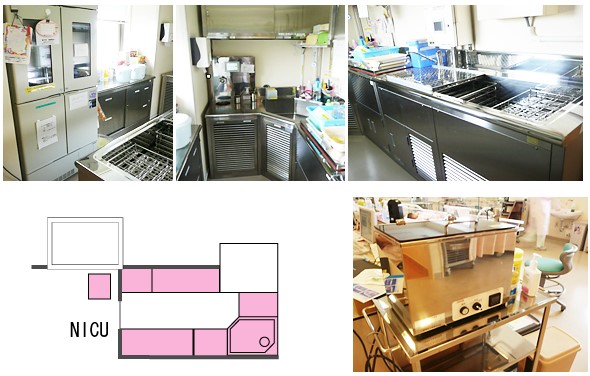 10名弱の新生児を看ています。ミルクは2種類を使用。栄養科スタッフが毎日定時に調乳室に入って調乳をしています。哺乳瓶・乳首・キャップ・シリンジの洗浄は専用流し台で手洗いし、滅菌は中央材料室で行っています。終末殺菌と冷却槽がコンパクトに配置されています。