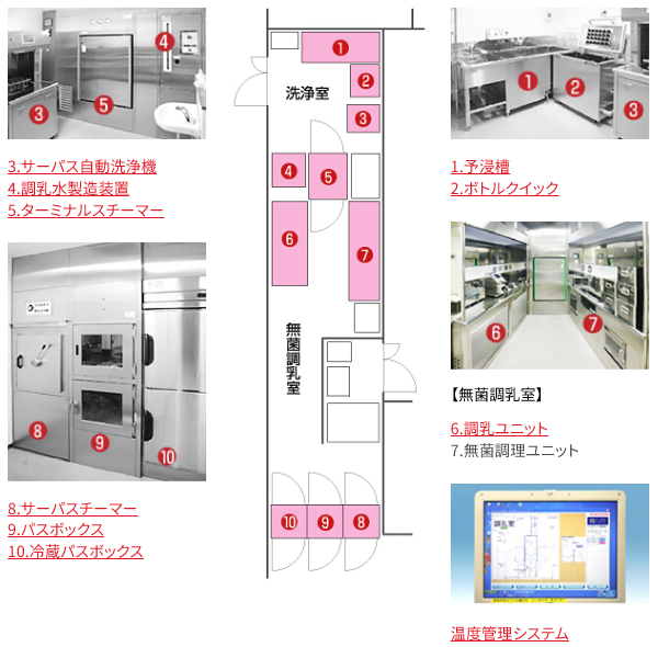三田理化工業(株)は、同病院の無菌製剤室および無菌調乳室の開発に約5年間、計画段階から携わらせていただきました。洗浄・滅菌・充填機器の開発を通して永年培った信頼の技術と経験をもとに、先生方のご指導を受けながら、まさに医療新時代を先駆ける貴重な実績を積ませていただくことができました。