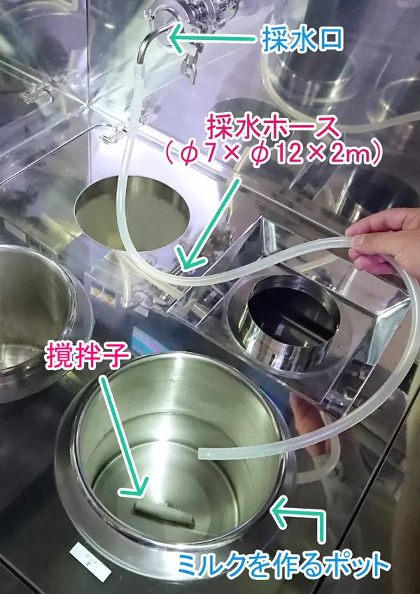 調乳ポットをはじめとする金属部品はすべてステンレス性、電解研磨加工処理を施しており、サビ・破損が生じにくい材質を使用しております。また、調乳ポットの大きさや数など、お客様の実際の調乳量に応じて決定する事ができます。