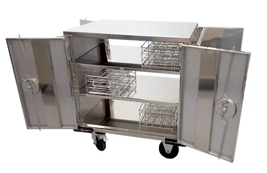 配乳車は調乳室でつくられた無菌ミルクを汚染することなく、完全無菌のまま配乳致さねばなりません、冷蔵庫内より取り出された哺乳瓶をコンテナに装填のまま、無菌箱に入れて配乳車で配乳します。棚板2枚付の三段です。