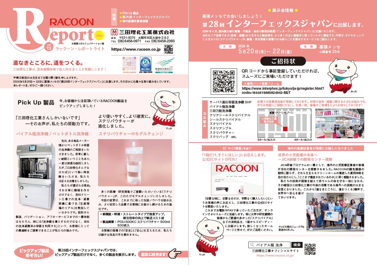 RACOON Report Lite vol.13を発行しました 2026.04.08 ニュースリリース 平素は格別のお引き立てを賜り厚く御礼申し上げます。この度、ラックーンレポートLite vol.13を発行いたしました。 新商品のご紹介だけでなく、展示会の出展案内、当社の取り組みをご紹介しています。 三田理化工業の今、がわかります!よろしければご一読ください。 racoonlite_vol13【完成版】ダウンロード 過去のRACOON Reportはこちらからご覧いただけます。 三田理化タイムズ 前の記事へ 最新情報一覧へ 次の記事へ